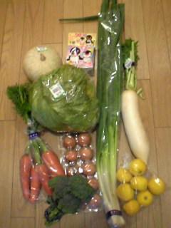 かぼちゃ・レタス・ネギ・大根・人参・卵・ブロッコリー・ゆず・ふりかけ(?) です。